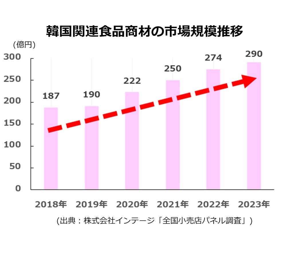 K-POPや韓国ドラマ等の流行に伴い、生活者の韓国文化への興味・関心が高まる中、2023年度の韓国関連食品商材の市場規模は2018年度比約150%(約290億円規模)と中長期的に拡大しており(右図参照)、家庭内での韓国メニューの喫食機会が増加しています。