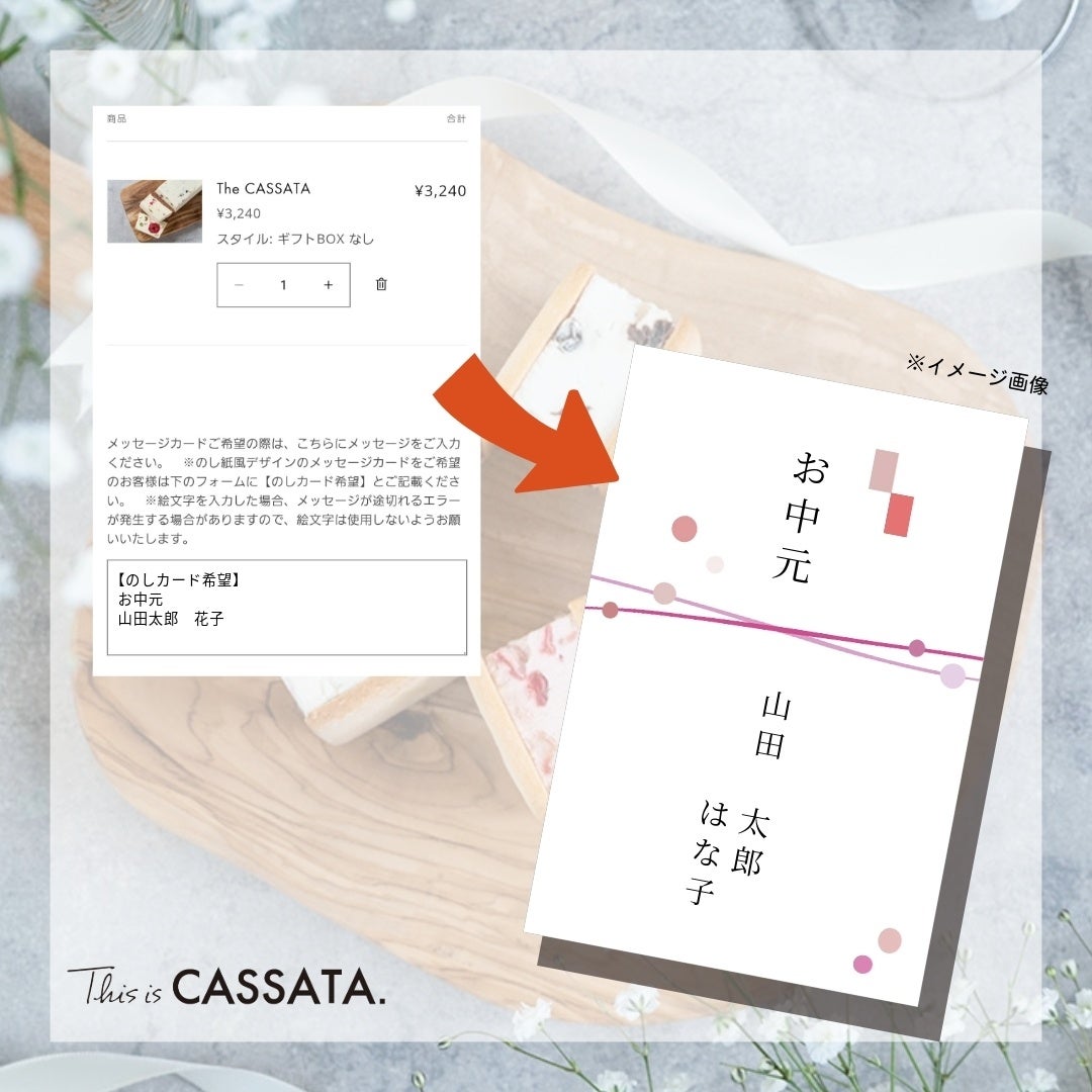 This is CASSATA.では通常デザインのメッセージカードの他に、のしデザインのメッセージカードをご用意しております。