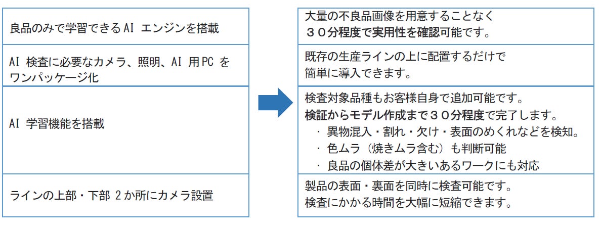 これまでのAIによる外観検査は、大量の不良品画像を集めてAIで学習させ実用性をPoC(Proof of Concept)で検証したり、生産ラインの撮像環境やPC導入環境を検討したりと、非常に手間と時間と費用が掛かるものでした。