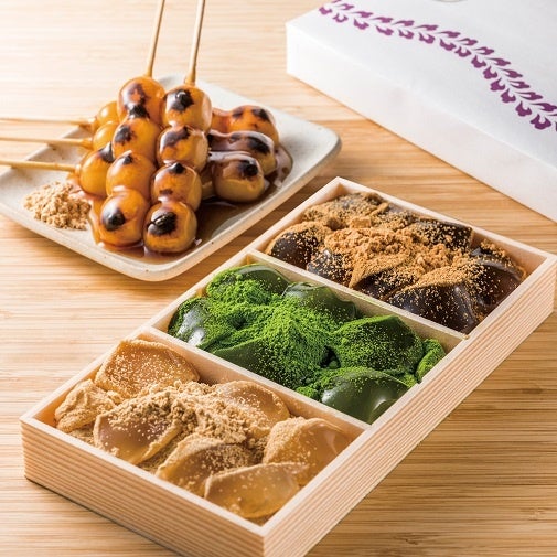写真奥:みたらし団子(5本入) 601円 写真手前:わらび餅3色詰合せ(1折) 1,251円