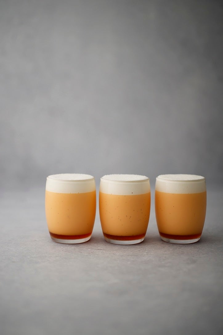 紅玉子を使用したプリンは、濃いオレンジ色。そこにたっぷりとバニラビーンズを使用しました。滑らかな口溶けをお楽しみください。