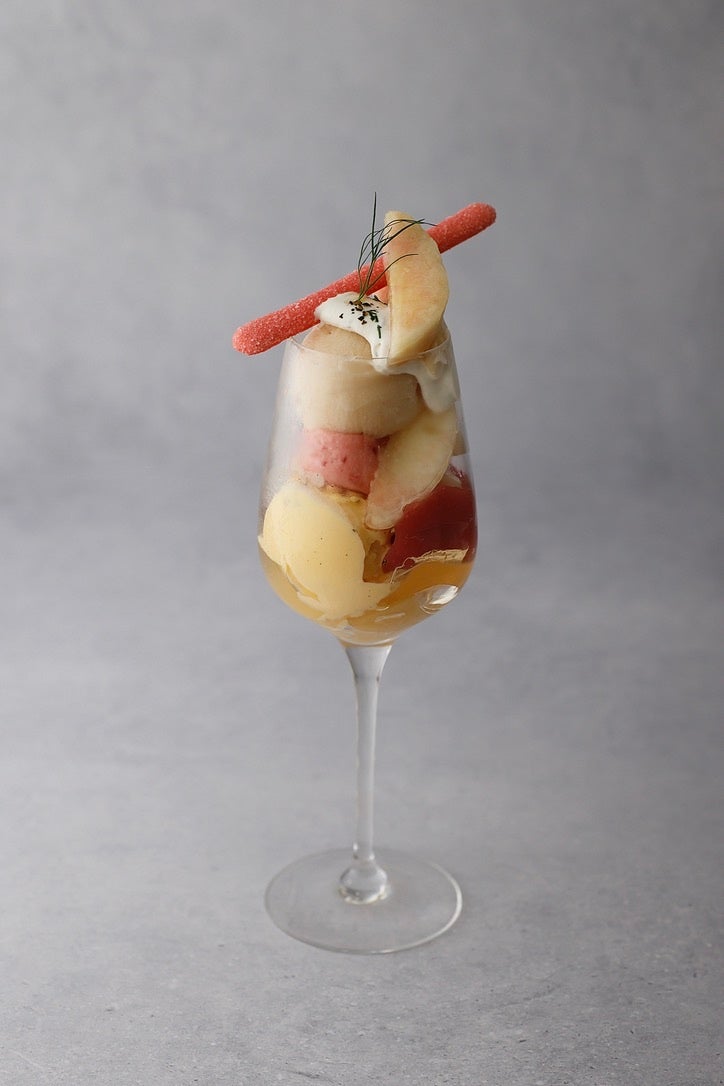 桃の美味しさをさらに引き立てるため、コンポートにはカルダモンとバニラを。桃のソルベ、すももとヨーグルトのソルベに、さらにオリーブオイルのアイスを加える事でアイスの融点の違いを楽しめます。また、ギリシャヨーグルトとディルのクリームや、ブラックペッパーなどのアクセントを味わいながら、全てが混ざっても美味しく感じる桃とのマリアージュをお楽しみいただけます。