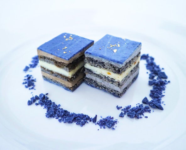 バタフライピーというマメ科植物から抽出した天然由来の色素をホワイトチョコレートに混ぜることで、鉱物「ラピスラズリ」の美しい青色を再現したケーキです。バタフライピーは抗酸化作用を持つアントシアニンを含み、原産の東南アジアでは美容や健康維持のハーブとして人気です。仕上げに金粉をあしらって、星空のようなラピスラズリのテクスチャーになっています。