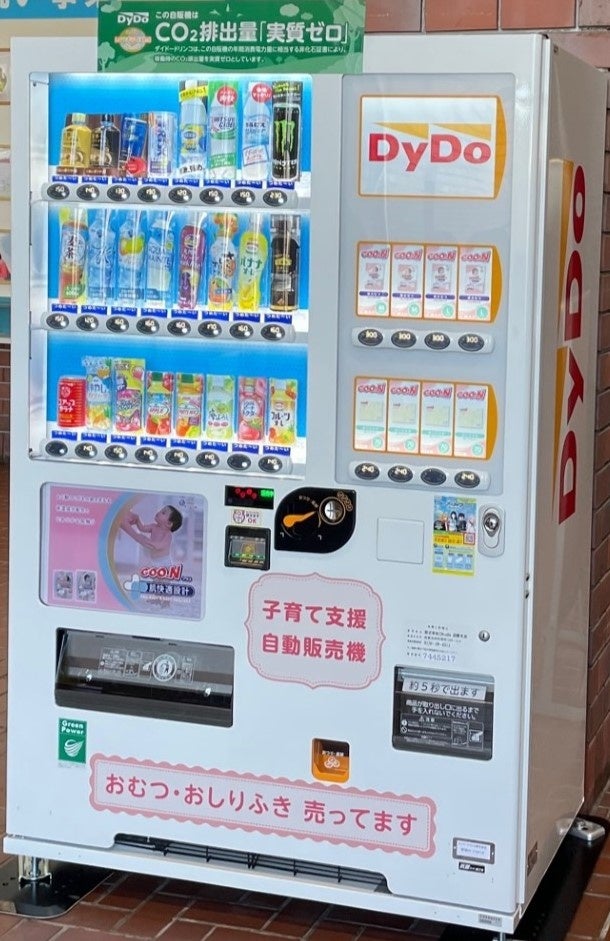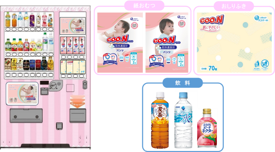 本自販機は、子育てしやすい環境づくりを進めている同町に対して、自動販売機を通じて貢献できればと企画したもので、飲料とともに、ベビー用 紙おむつの小パック(2 枚入り)やおしりふきシートを購入することができます。