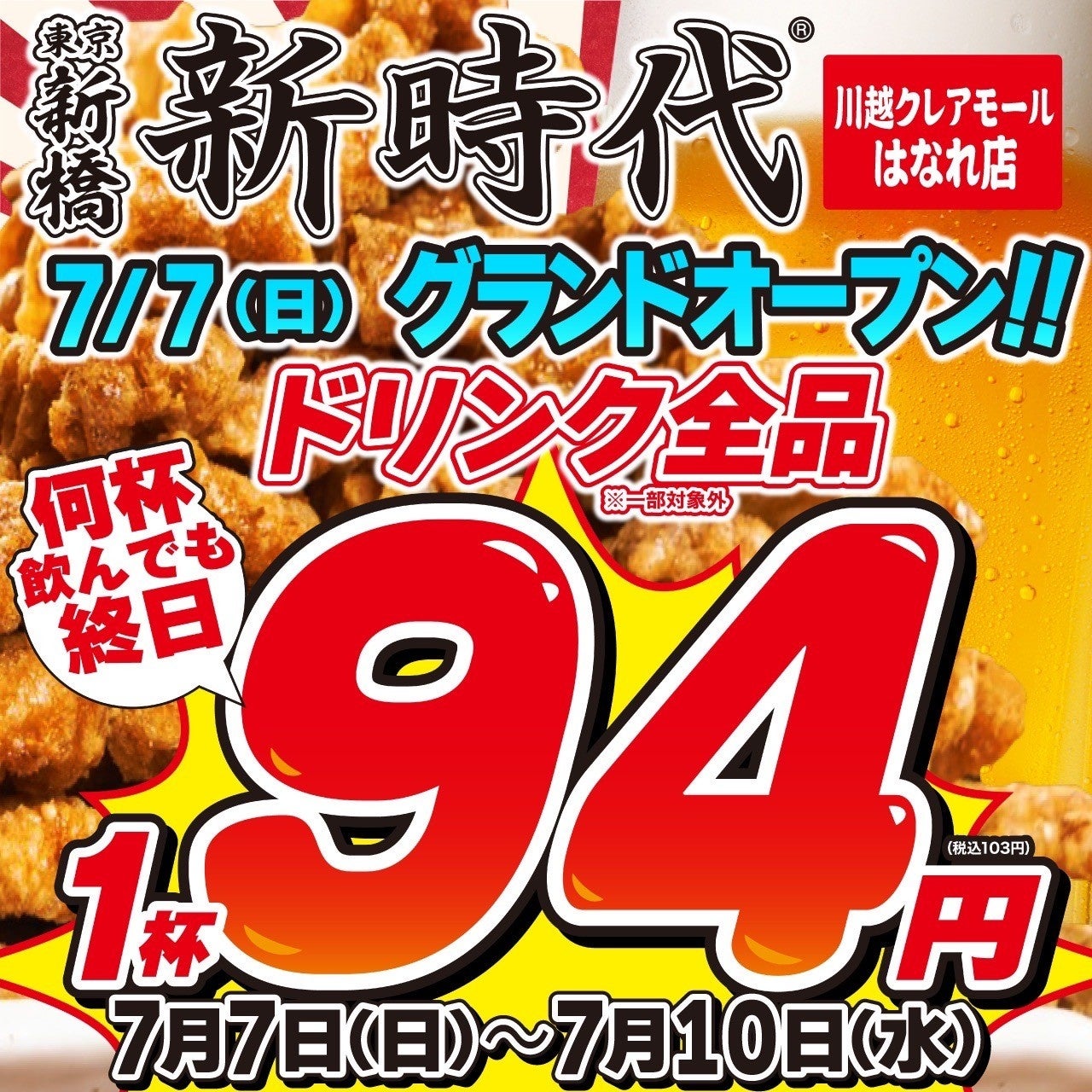 「新時代 川越クレアモールはなれ店」のオープンを記念し、ドリンク全品94円(税別)キャンペーンを開催します。ぜひお越しください。