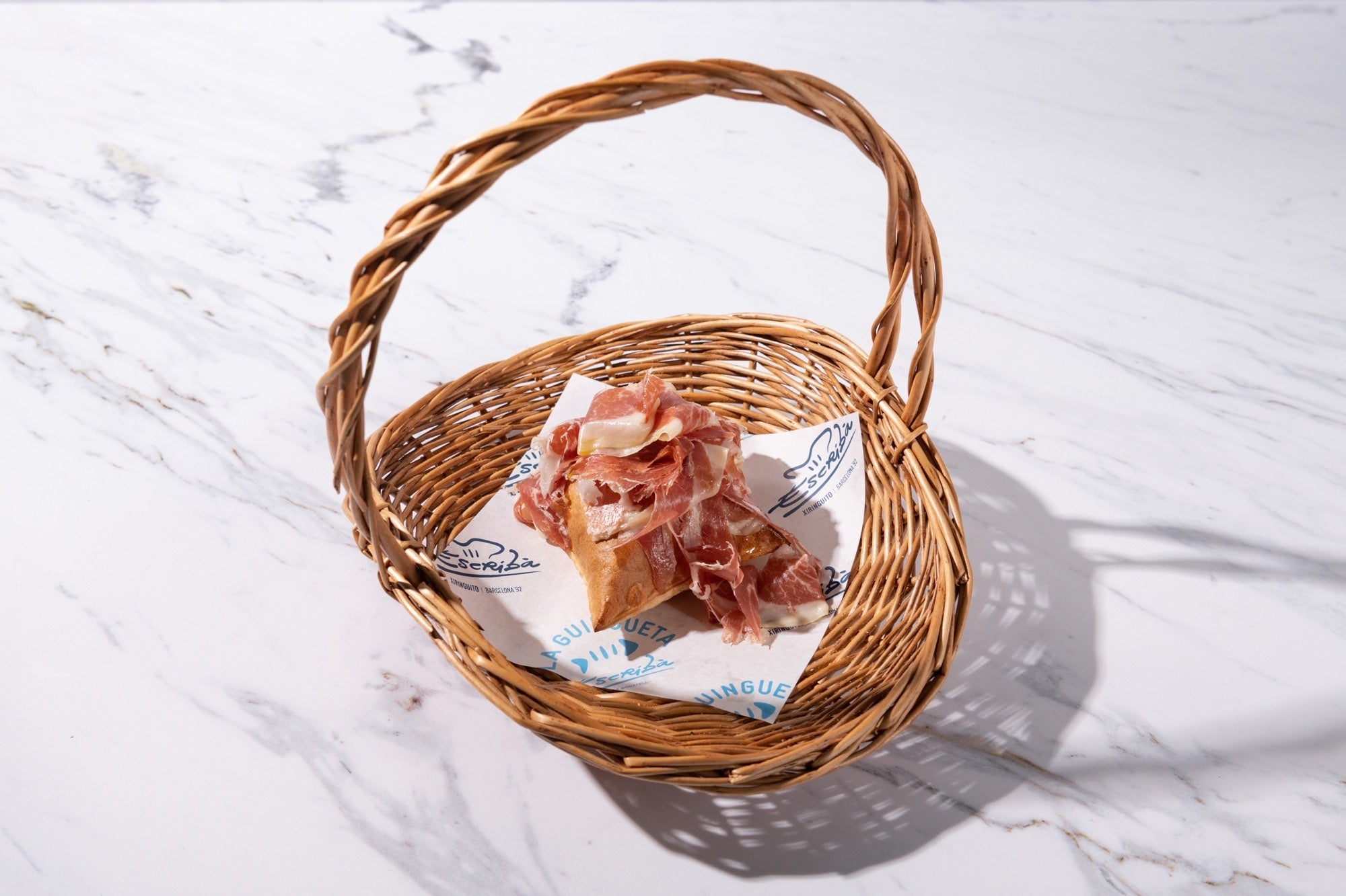 エアバッグに見立てたピザ生地の上に、スペイン産イベリコ豚の生ハムをたっぷりと乗せた一品。ピザ生地を崩しながら、生ハムと一緒にどうぞ。