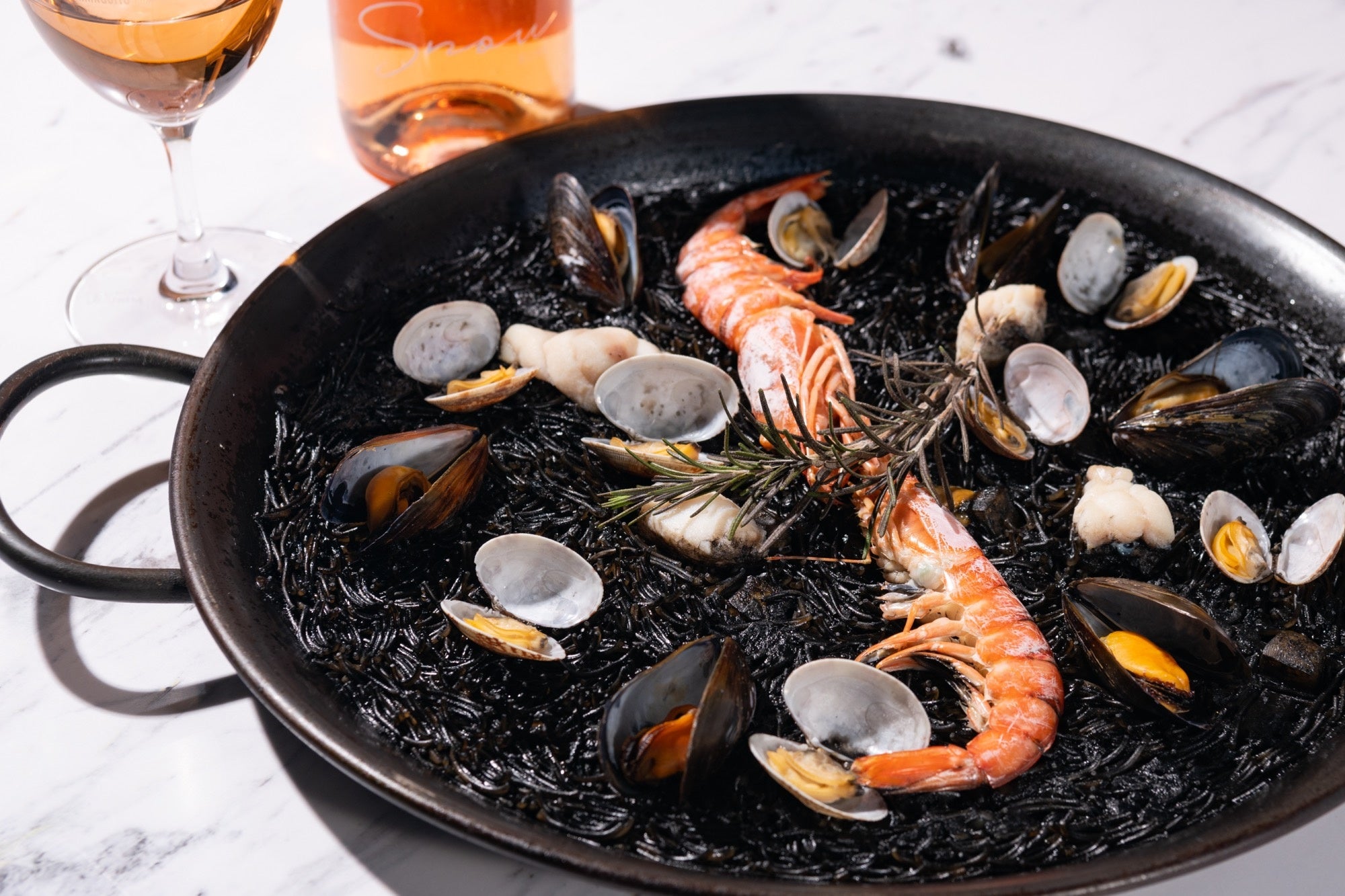 バレンシア米ではなく、パスタ(フィデウア)で作るパエリア。イカスミの濃厚な味わいが楽しめ、添えてあるアリオリソースをお好みでつけてお召し上がりください。