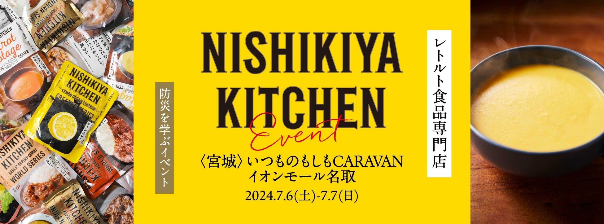 「世界の料理を『カンタン』に。」をコンセプトに掲げ、レトルトカレーやスープなどを販売するレトルト食品専門店NISHIKIYA KITCHEN(ニシキヤキッチン)(株式会社にしき食品 本社:宮城県岩沼市、代表取締役:菊池洋)は、無印良品を展開する株式会社良品計画(本社:東京都文京区、代表取締役社長:堂前宣夫)とイオンモール株式会社(本社:千葉県千葉市)が共同開催する、「いつものもしもCARAVAN」に参加いたします。本イベントは、予測ができない災害に対して「いつ起こっても大丈夫」といえるように日常から備えを行うことが大切と考え遊びながら楽しく防災を学ぶ株式会社良品計画のイベントで、7月6日(土)、7日(日)に「イオンモール名取(宮城県名取市、ゼネラルマネージャー:八幡啓渡)」で開催いたします。ニシキヤキッチンでは、温めなくても食べられるレトルト食品の試食や1日分の防災セットなどが当たる「レトガチャ」の設置、備蓄にぴったりなストック箱の提供をいたします。レトルト食品は常温で長期保存が可能なため、非常食にもぴったりな食品です。レトルト食品の購入に使えるお得なクーポンも配布いたします。