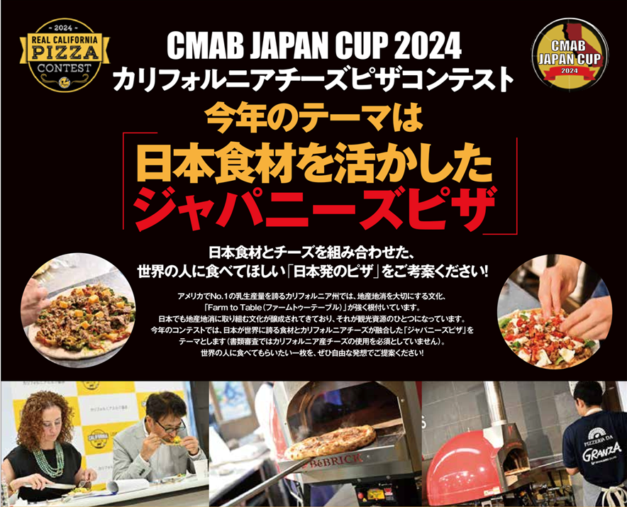 アメリカでNo.1の乳生産量を誇るカリフォルニア州では、地産地消を大切にする文化、「Farm to Table(ファームトゥーテーブル)」が強く根付いています。日本でも地産地消に取り組む文化が醸成されてきており、それが観光資源のひとつになっています。今年のコンテストでは、日本が世界に誇る食材とカリフォルニアチーズが融合した「ジャパニーズピザ」をテーマとします(書類審査ではカリフォルニア産チーズの使用を必須としていません)。世界の人に食べてもらいたい一枚を、ぜひ自由な発想でご提案ください。
