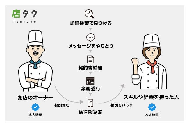 従来の店タクでは、ユーザー同士がマッチング以降は自由に契約や決済の取り決めを行う仕組みでしたが、それに伴う信頼性やトラブルの問題も危惧されておりました。今回のリニューアルにより、本人確認やセキュアな契約締結、オンライン決済機能を新たに導入することで、ユーザーの皆様が安心して取引ができる環境を整えます。