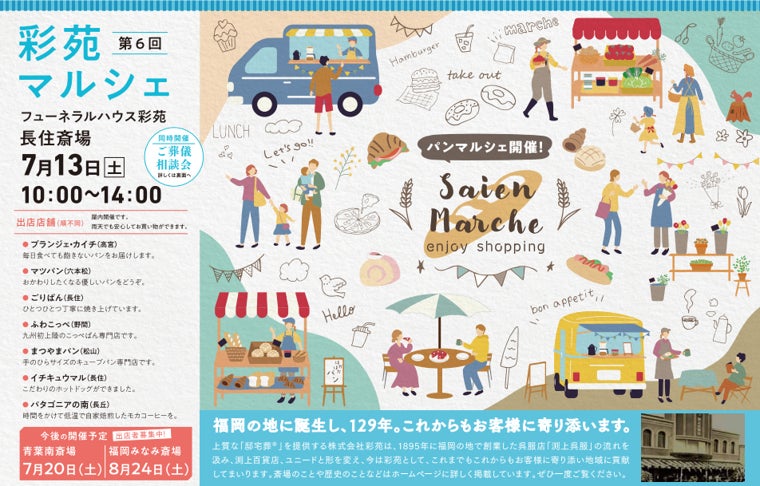 6月22日(土)に福岡みなみ斎場にてマルシェを実施いたしました。毎回地元に根づいたさまざまなお店が出店することに定評があり、今回の福岡みなみ斎場には全14店舗のパン屋をはじめとする地元のお店が出店し、計174名の方にご来場いただきました。