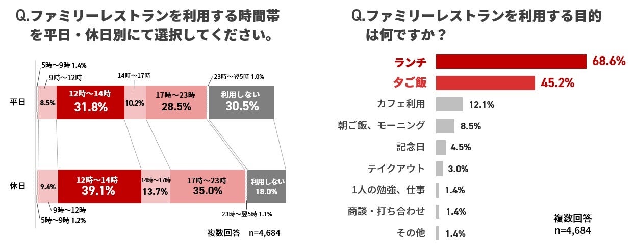 着目したのが、利用者が少ないランチタイムとディナータイムの境目の時間(14時~17時)です。ランチ利用が平日・休日ともにそれぞれ8割近くおり最多でしたが、これに次いだのは、カフェ利用ではなく、ディナー利用でした。早めの夕ご飯で利用する人も多く、特に平日よりも休日のほうが割合の多い(11.6ポイント差)傾向にあります。
