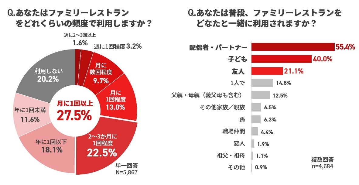 ファミリーレストランを誰と一緒に利用するかを聞いたところ、「配偶者・パートナー」が55.4%でトップでした。次に「子ども」(40.0%)でした。一方、「1人で」利用すると答えた人は14.8%にとどまりました。文字通り、家族で利用する人が多いことがわかります。3位には「友人」(21.1%)と、カジュアルな集まりの場としても活用されていることがわかります。
