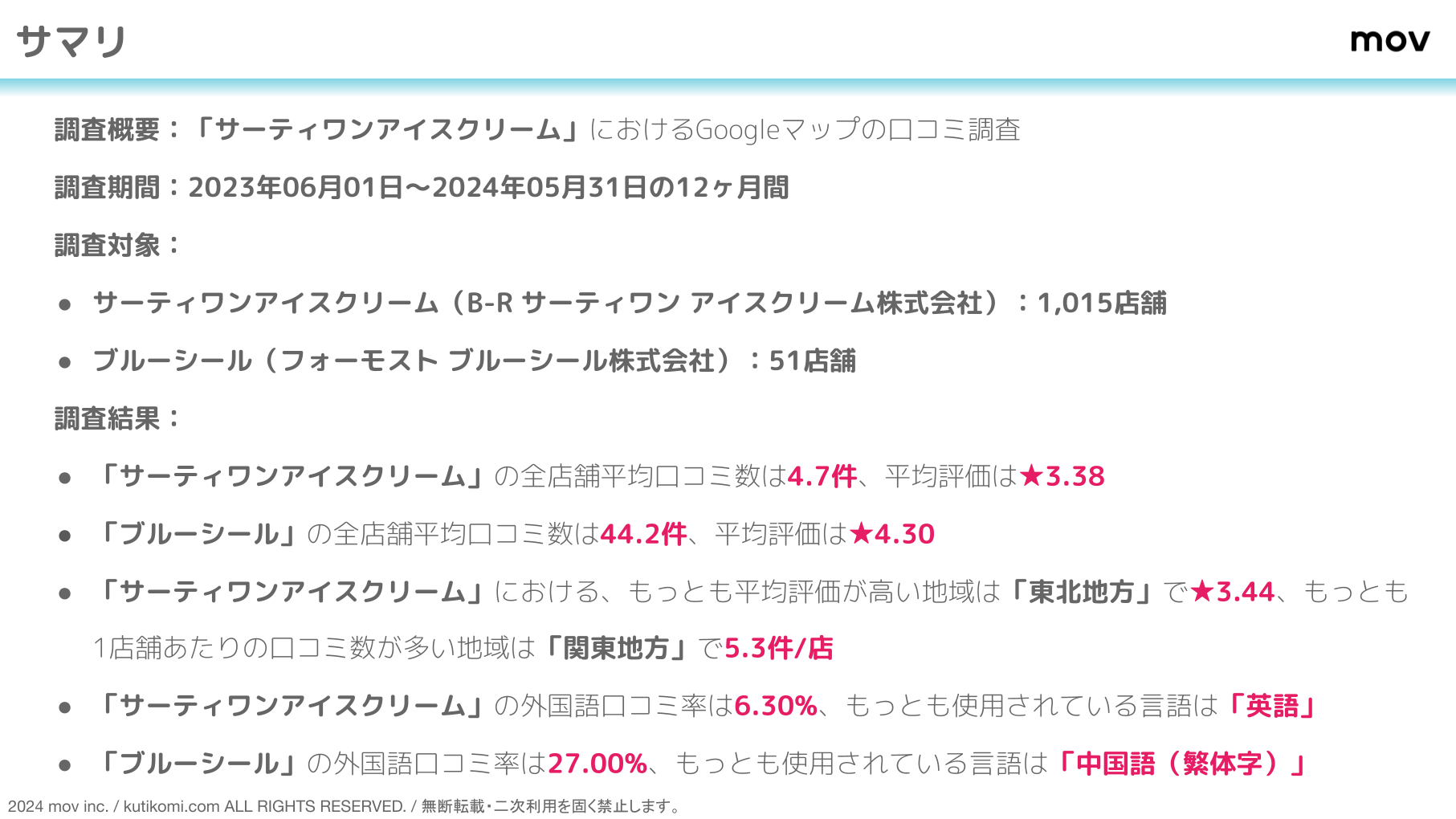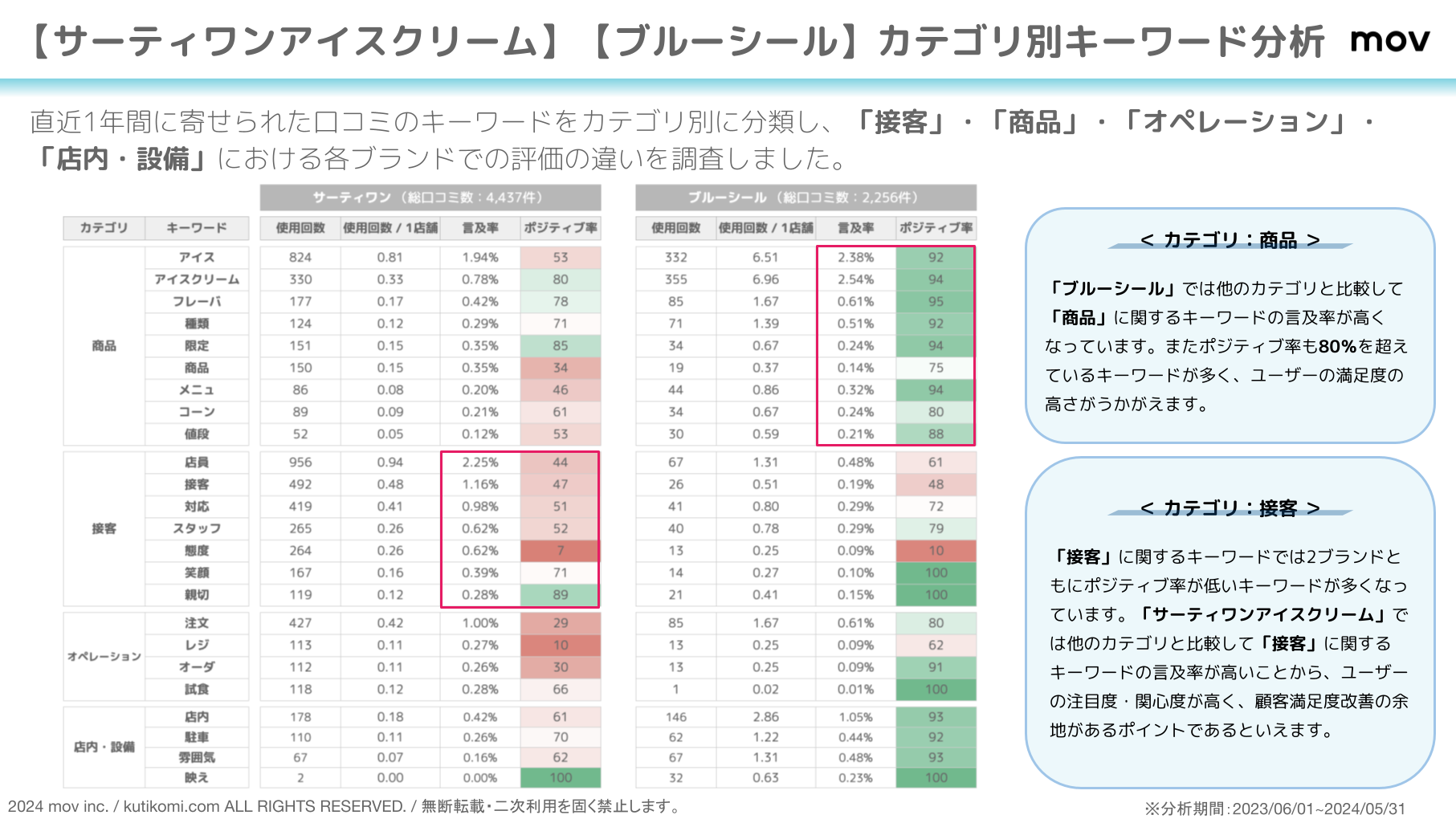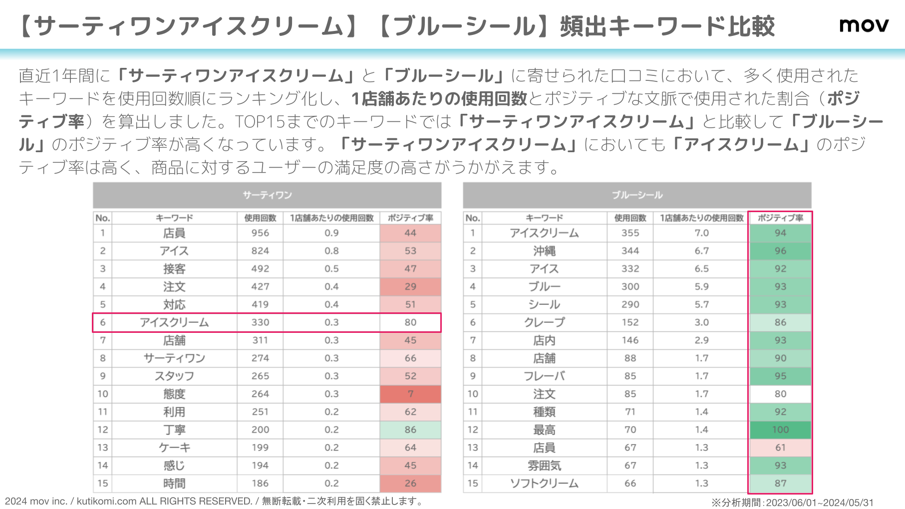 今回は「サーティワンアイスクリーム」・「ブルーシール」に寄せられた約6,600件の口コミを分析しました。