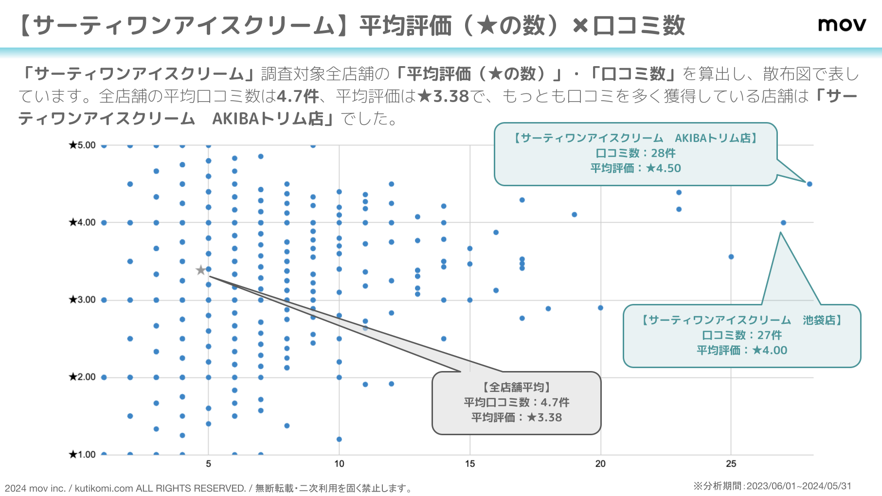 「サーティワンアイスクリーム」調査対象全店舗の「平均評価(★の数)」・「口コミ数」を算出し、散布図で表しています。全店舗の平均口コミ数は4.7件、平均評価は★3.38で、もっとも口コミを多く獲得している店舗は「サーティワンアイスクリーム AKIBAトリム店」でした。