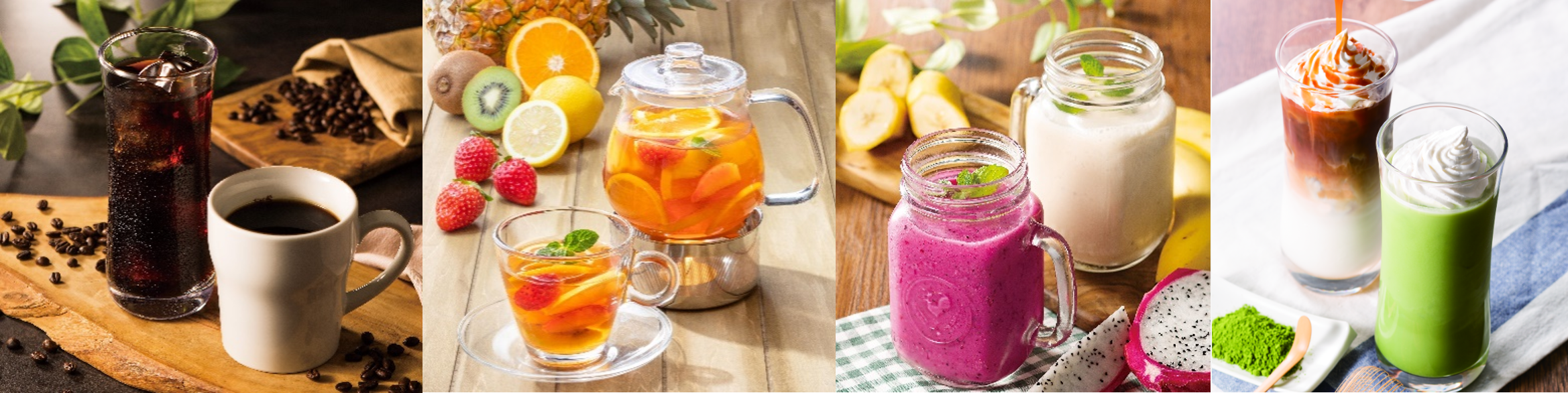 100%オーガニック、レインフォレスト・アライアンス W認証の珈琲豆を使用した「ブレンド珈琲・アメリカン珈琲」や、5種のフルーツとティーを合わせた華やかな香り広がる「HOT!フレッシュフルーツティー」、スムージーやフローズンドリンクなど、多彩なフードやスイーツにもぴったりのバラエティに富んだドリンクメニューをご用意しております。