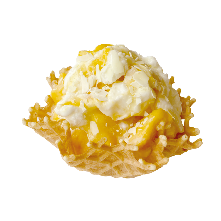 「マンゴ アンニン」は、アンニンジェラートに、ゴロッと贅沢にマンゴ果肉を2倍(当社比)使用し、食感がパリパリッと楽しい濃厚なホワイトチョコレートと、酸味のあるパッションフルーツソースを組み合わせた、あと味がさっぱりしたジェラートです。