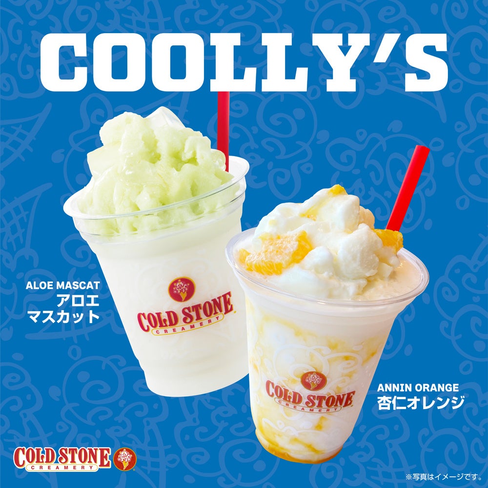 また同時販売で夏の定番ドリンクメニュー、フローズンヨーグルトドリンク『COOLLY’S(クーリーズ)』の期間限定メニュー「杏仁オレンジ」・「アロエマスカット」を販売!クーリーズは、フローズンヨーグルトの上にアイスクリームをトッピングした商品で、ヨーグルトならではの爽やかでコクのある味わいで、今回はヨーグルトドリンク単体でも販売いたします。