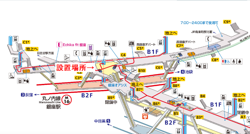 設置場所は、東京メトロ丸の内線数寄屋橋改札口を出てすぐ、C2出口の近くとなります。メトロ構内なので、空調も効いて、雨の日でも濡れることなく、快適にお買い物ができます。
