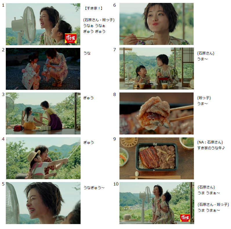 CMは、石原さんと姪っ子が扇風機に向かって「うなぁ うなぁ ぎゅう ぎゅう」と恒例のかけ声を叫んでいるシーンからスタート。浴衣での花火や縁側でのお絵かきなど、日本の夏を象徴する風景に続いてすき家の「うな牛」が登場します。口いっぱいに「うな牛」を頬張り、至福の表情を浮かべる石原さんと姪っ子。“ああ、私は、これを待ってたんだな。”と夏の風物詩を堪能する石原さんの表情にご注目ください。