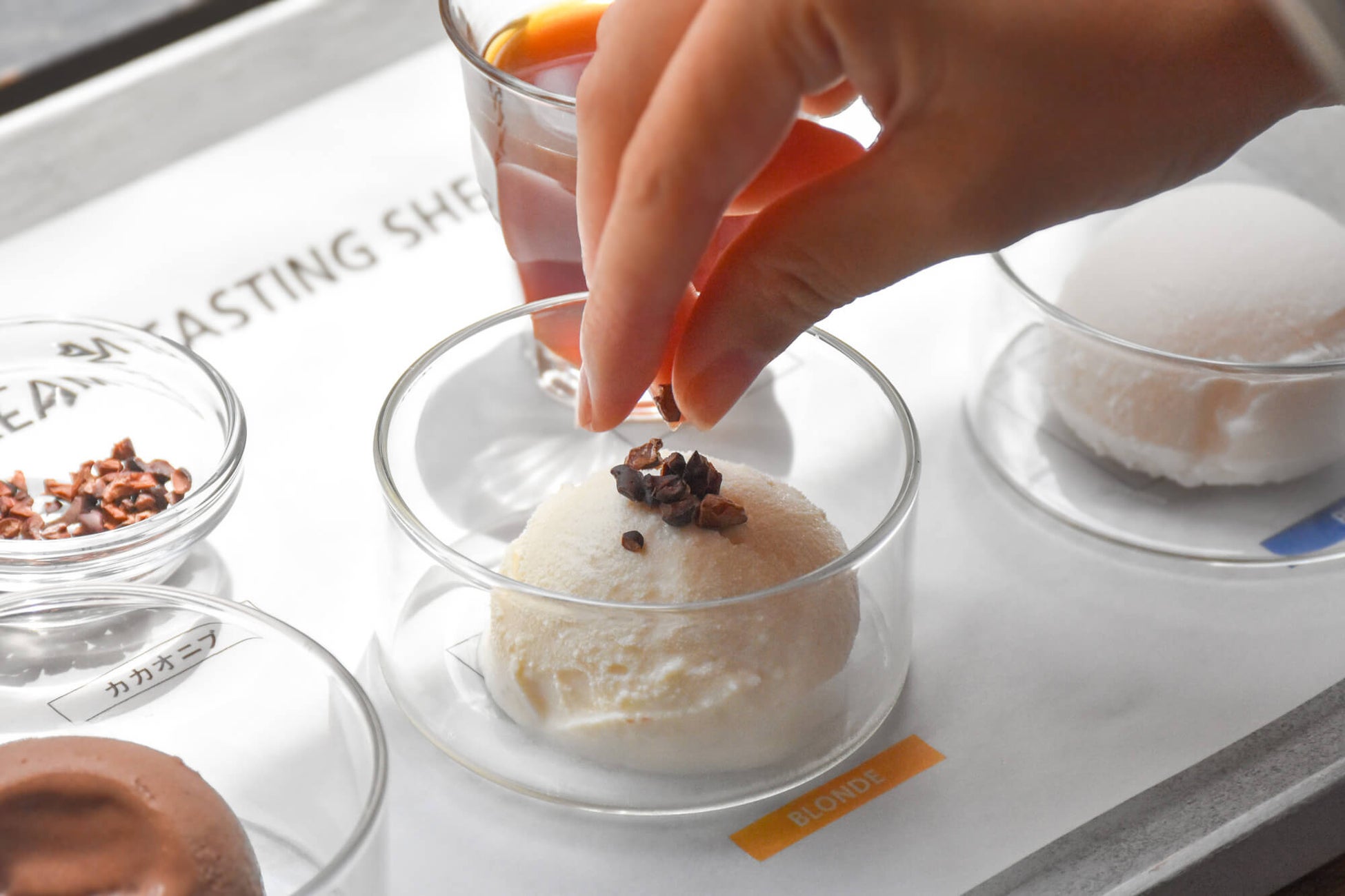 付属のカカオニブは、NUTTYアイス、もしくはBLONDEアイスにかけて食感と味わいの変化をお楽しみください。
