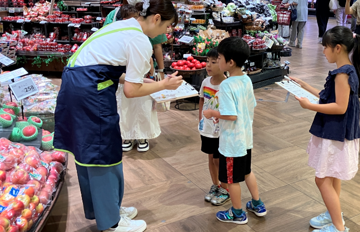 食べ物が黄・赤・緑の3つのグールプに分類でき、それぞれに「力や熱になる」「血や肉になる」「体の調子を整える」という働きがあることを説明しました。また、親子ペアになって葉を食べる野菜、外側と内側の色が違う野菜、実を食べる野菜、根を食べる野菜を、実際に野菜売り場で探すミッションゲームでは参加者は真剣に売り場を探索していました。