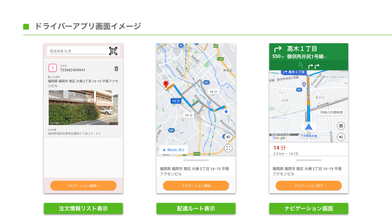 ・配達員がドライバーアプリでお届け場所までのルート検索とナビゲーション機能を利用することが可能