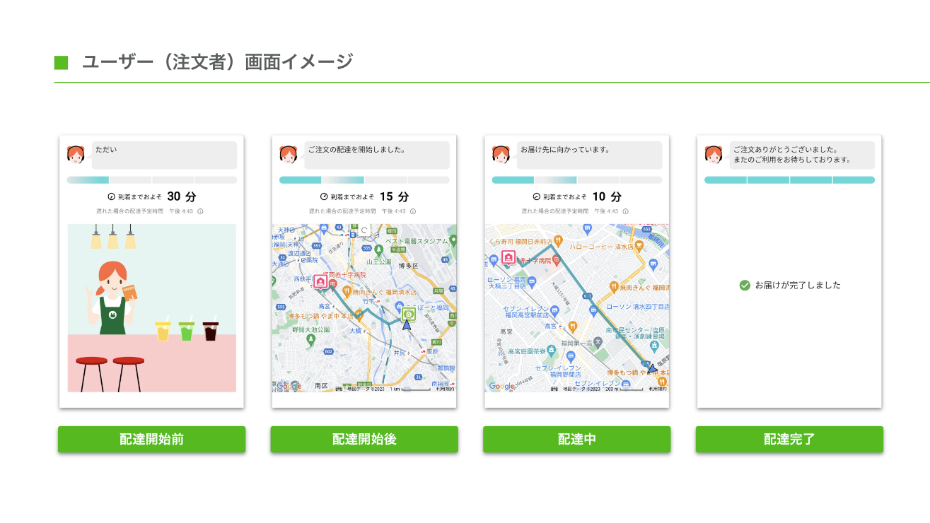 ・ユーザが配達状況やお届け場所までのルートや配達予定時間を Google マップ上でリアルタイム表示