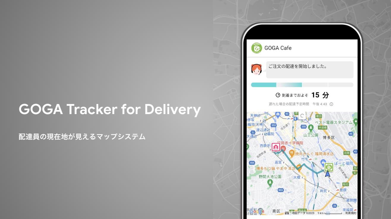 「GOGA Tracker for Delivery」は、Google Maps Platform モビリティーサービスを活用し、配達員の現在地を Google マップ上に表示することができるプロダクトです。リアルタイムの配達状況、お届け場所までのルート、配達予定時間を確認することができます。