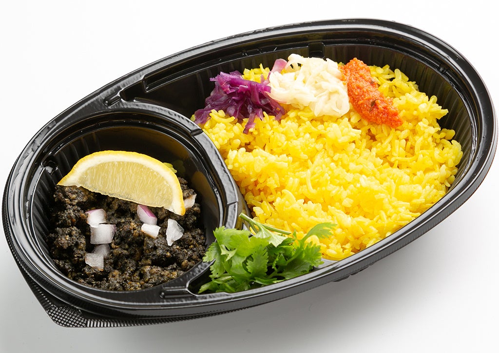 イカスミを贅沢に使った渡邊咖喱オリジナルのキーマカレーです。付属のレモンを絞るとそのまま食べるのとはまた異なる爽やかな風味に味変でき、一皿で二度美味しさと驚きを味わっていただけます。