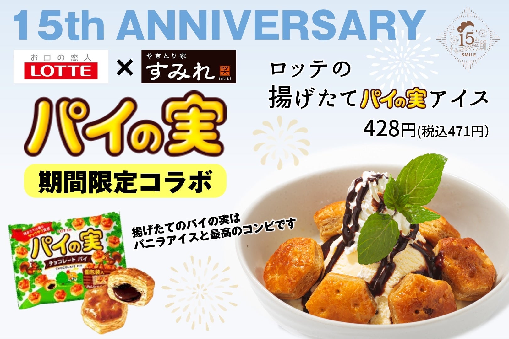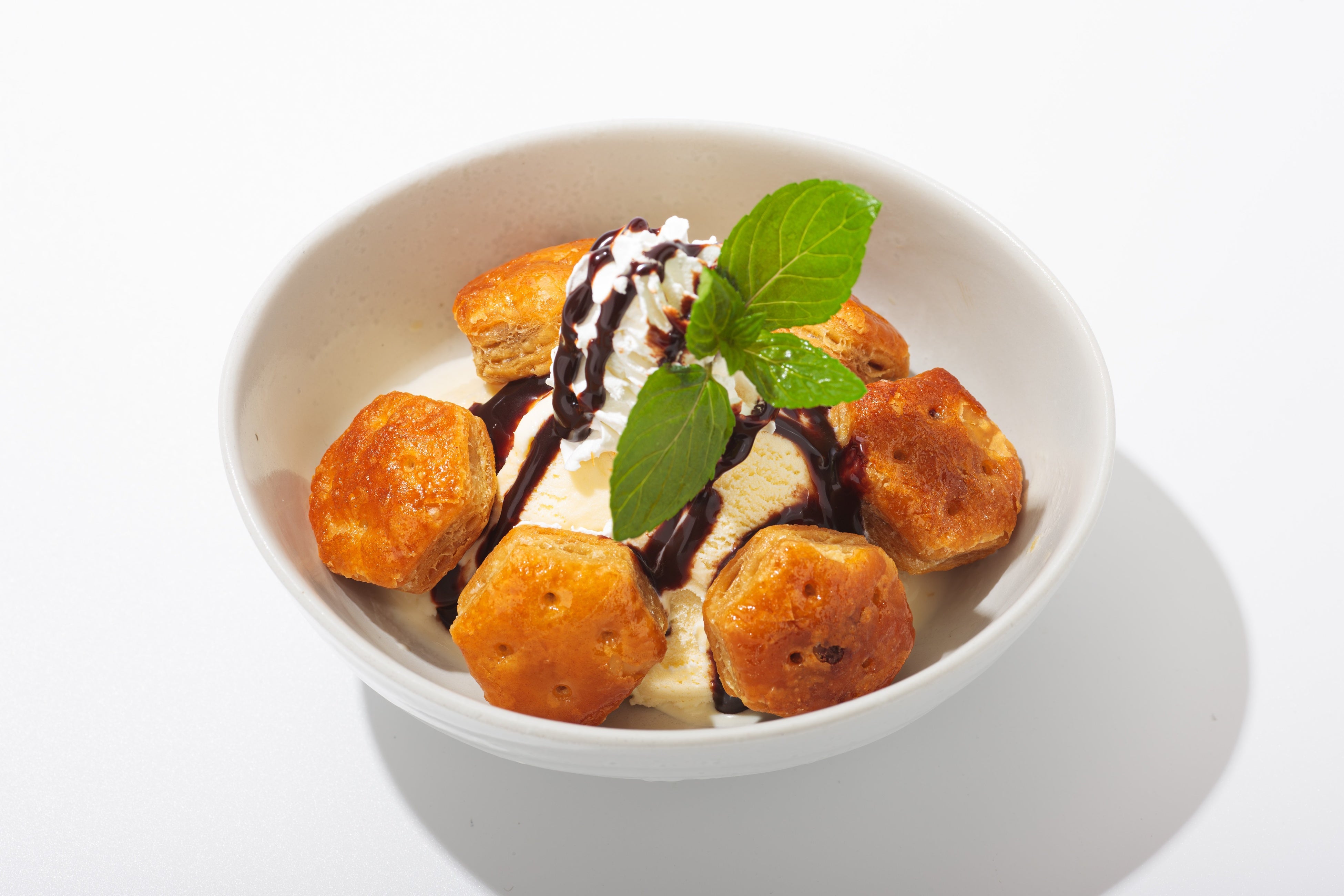 ロッテの人気商品「パイの実」を使用した特製デザート。お店で揚げた「パイの実」は、サクサクの食感と香ばしさが更に引き立ちます。揚げたてのサクサクのチョコパイを冷たいバニラアイスと一緒に楽しむことで、最高のコンビネーションが生まれます。トッピングされたチョコやホイップクリームとミントの葉が華やかさを加え、見た目も楽しめるこのデザートは、暑い夏の日にぴったりの贅沢なひとときを提供します。お友達や家族とシェアして楽しむのにもおすすめです。