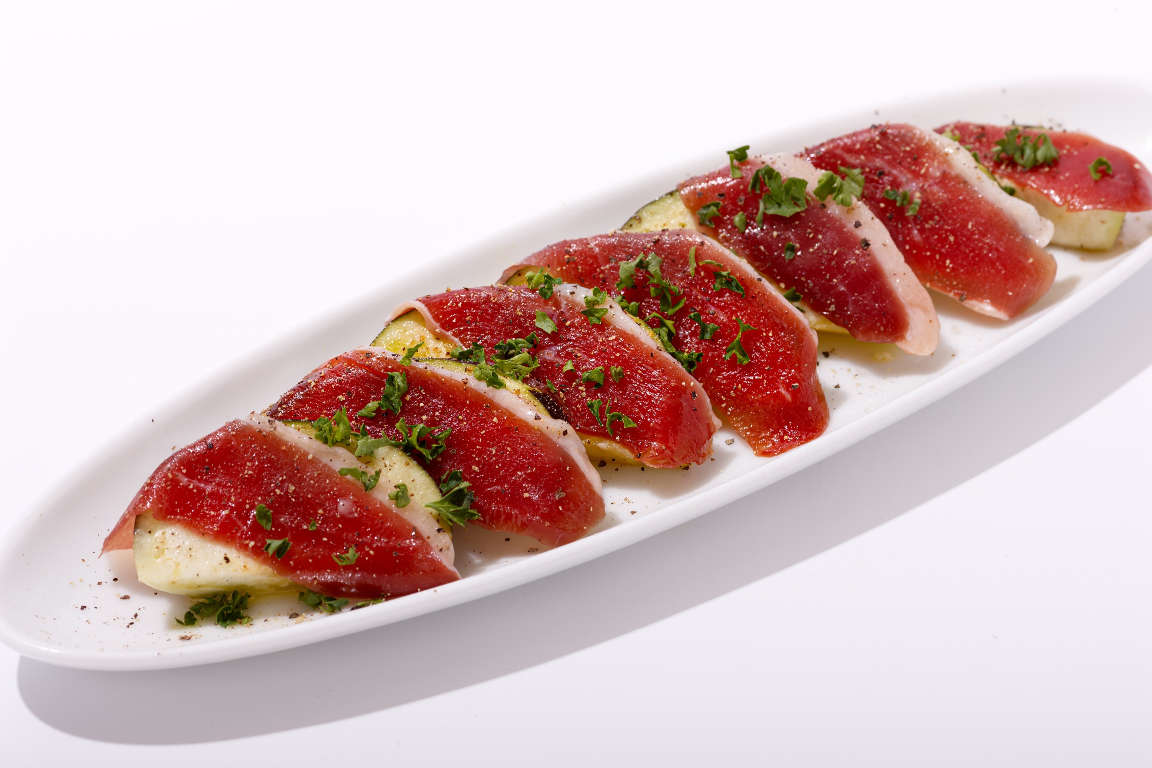 新鮮でみずみずしい水茄子のシャキシャキとした食感と、合鴨のしっとりとした食感が口の中で心地よく絡み合います。シンプルな塩とオリーブオイルで仕上げられたカルパッチョは、それぞれの素材の味を最大限に引き出し、上品な味わいを楽しむことができます。見た目にも鮮やかなこのカルパッチョは、暑い季節にぴったりの、爽やかでヘルシーな前菜としてお楽しみください。