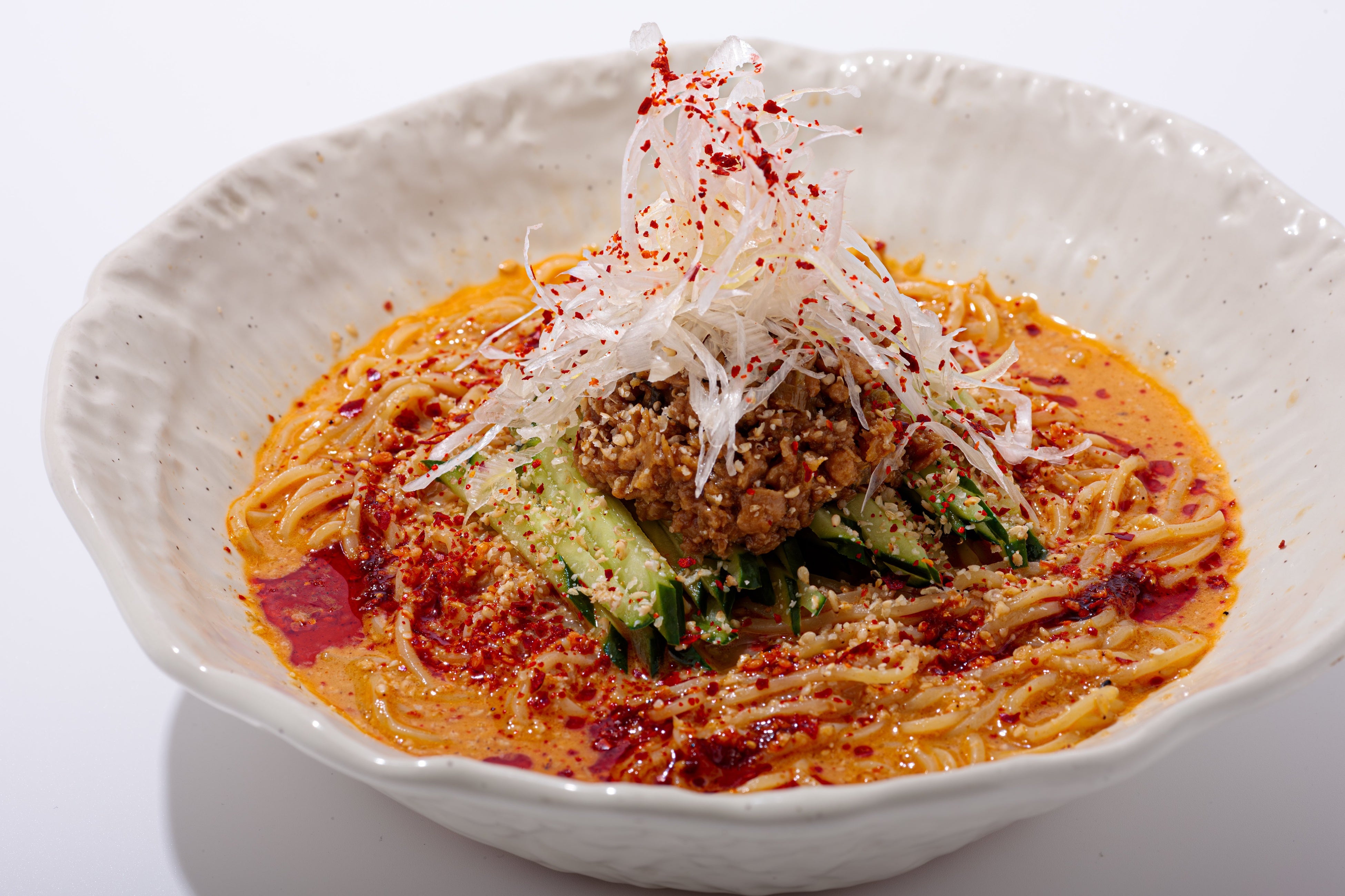 すみれ自慢の大山どりをふんだんに使用した冷やし坦々麺は、ゴマの風味が豊かで本格的な担々麺の味わいを冷たい一品に仕上げた贅沢な一皿です。痺辛のホアジャオがピリッと効いたスープは、辛さの中に深いコクを感じさせます。たっぷりの大山どりそぼろが麺と絡み、食べるたびに満足感を与えます。シャキシャキとしたキュウリと細切りのネギが、食感に爽やかさとリフレッシュ感を添え、暑い夏の日にもぴったりの一品です。