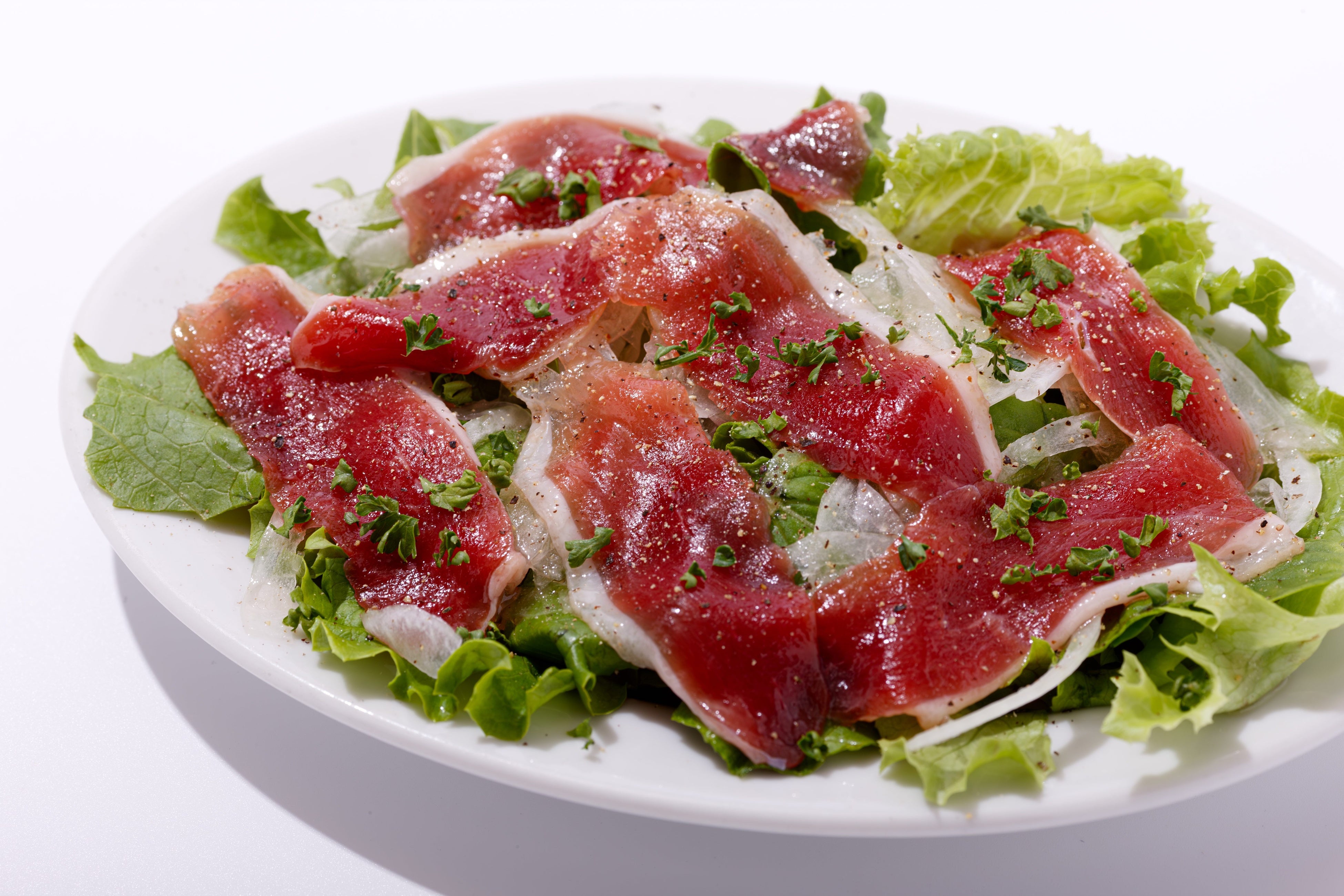 合鴨の生ハムが贅沢に乗ったさっぱりサラダは、夏にぴったりの一品。合鴨の旨味がぎゅっと詰まった生ハムは、しっとりとした食感で一口ごとに贅沢な風味が広がります。新鮮なレタスやオニオンスライスとともに、バルサミコ酢の酸味がアクセントとなり、全体をさっぱりとまとめています。ワインや焼酎、日本酒とも相性抜群で、お食事をさらに引き立てます。