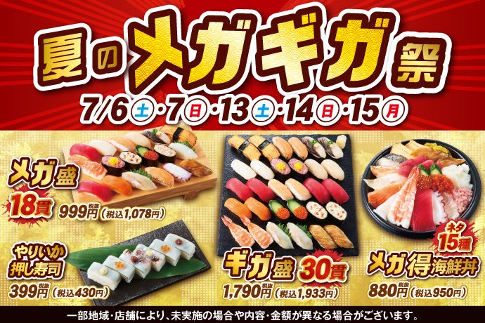 持ち帰り寿し店の「⼩僧寿し」「茶⽉」を運営する株式会社⼩僧寿しは、「⼩僧寿し」にて、7月6日(土)~7日(日)、13日(土)~15日(月・祝)の期間限定で、『夏のメガギガ祭』を開催致します。