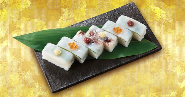 『やりいか押し寿司』は、シャキッとした歯ごたえが特徴のやりいかの押し寿司を、梅や生姜など爽やかなトッピングでご用意しました!