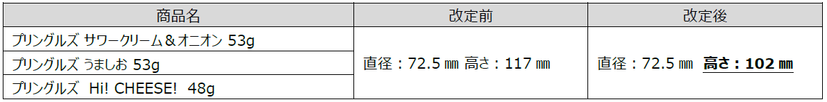 持ち運びやすさの向上、包材使用量の削減と缶の中の空間率減による配送時のチップスの欠損を軽減し品質改善を図るため、S缶(ショート缶)について、内容量は現行品と同量を維持しながら、サイズを15mm短くし、コンパクトでより持ち運びしやすく便利なパッケージを導入します。また、近年の原材料価格の大幅な上昇、並びに資材費やエネルギーコストなどの高騰を受け、自社の企業努力によるコスト削減だけでは、現状の価格の維持が極めて困難な状況に至っていることから、やむを得ず下記の通りの価格改定を実施させていただきます。