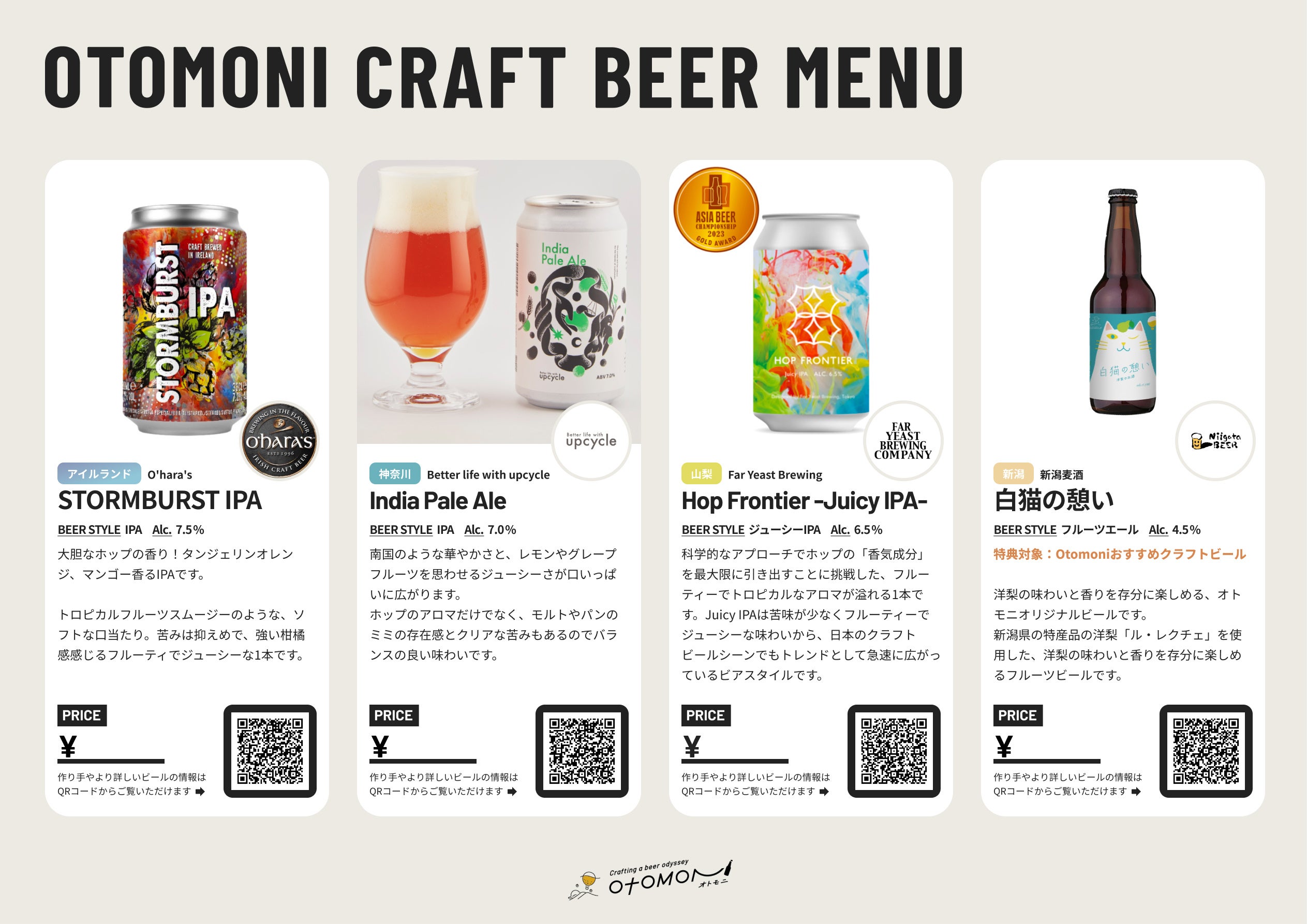 詳しくは、各店舗の「Otomoni CRAFT BEER MENU」をご覧ください。