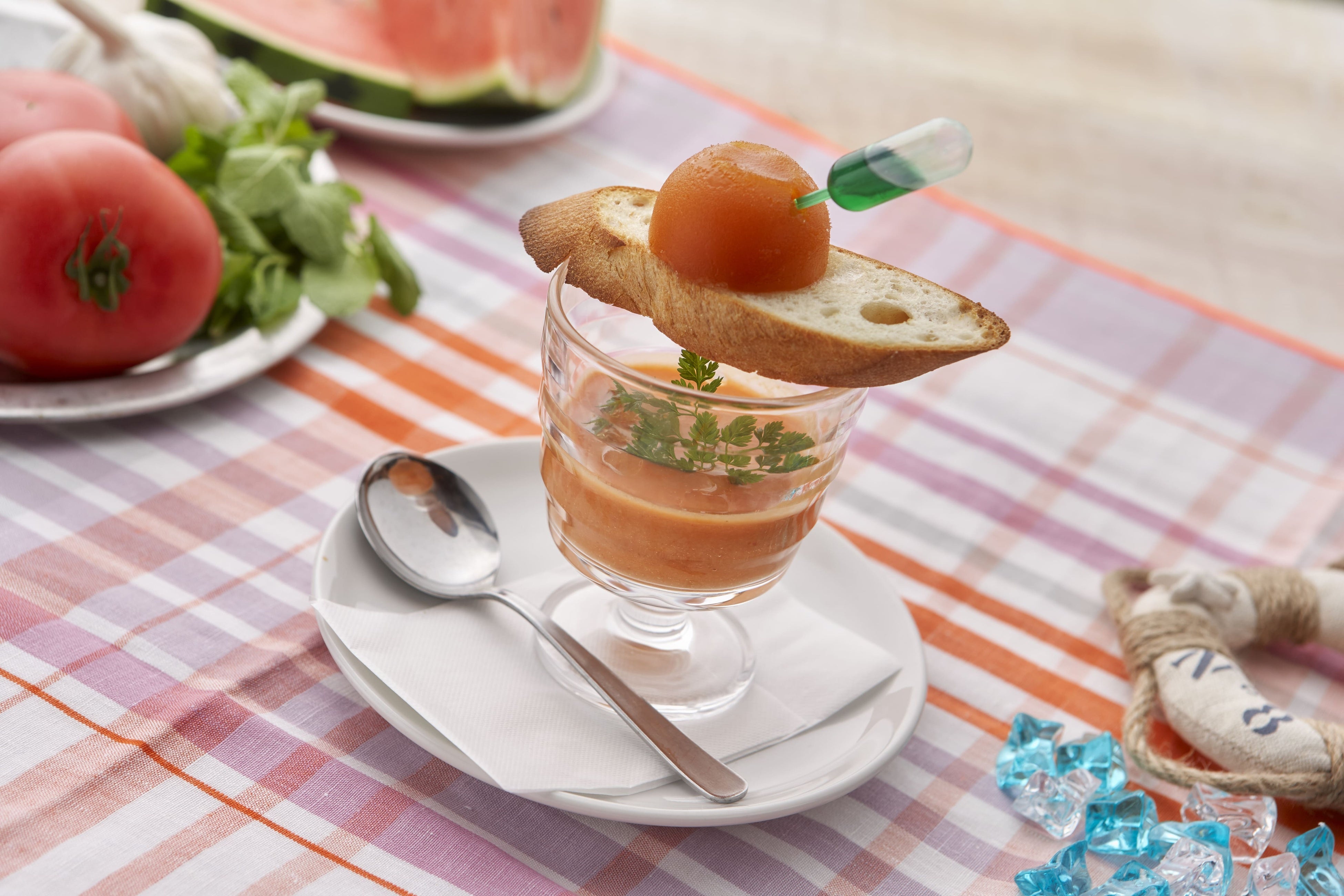 詳細:たっぷりの野菜が入ったガスパチョは暑い夏にぴったりな栄養たっぷりの“飲むサラダ”。ガツン!と効いたガーリックとスイカの優しい甘さの調和が身体に沁みわたります。トマトシャーベットゼリーとご一緒に!