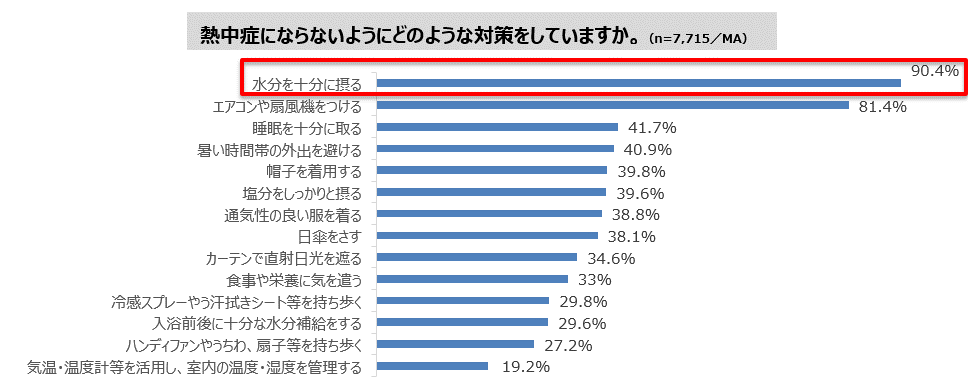 熱中症にならないようにどのような対策をしていますかと質問したところ、1位は「水分を十分に摂る」で90.4%。2位は「エアコンや扇風機をつける」で81.4%、3位は「睡眠を十分に取る」で41.7%。