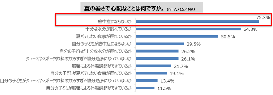 夏の暑さで心配なことは何ですかと質問したところ、1位は「熱中症にならないか」で75.3%。