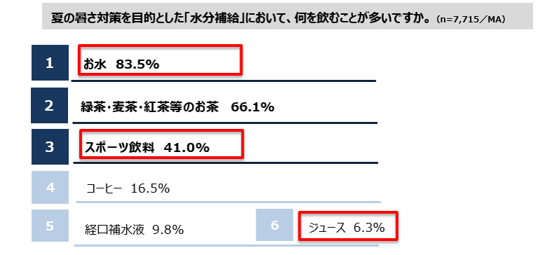夏の暑さ対策を目的とした「水分補給」で飲む飲み物1位は「お水」で83.5%。