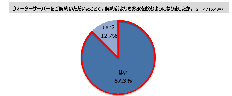 ウォーターサーバーをご契約いただいたことで、契約前よりもお水を飲むようになった方の割合は87.3%にも上りました。ご契約者様からは「いつでも飲みやすい温度のお水が飲めるようになった」、「水道水よりも飲みやすい」、「白湯が簡単に作れるので、白湯を飲む習慣ができた」、「契約するまではペットボトルのジュース等を買っていたが、契約してからはお水があるから買わなくなり、お水をたくさん飲むようになった」等のお声もいただきました。
