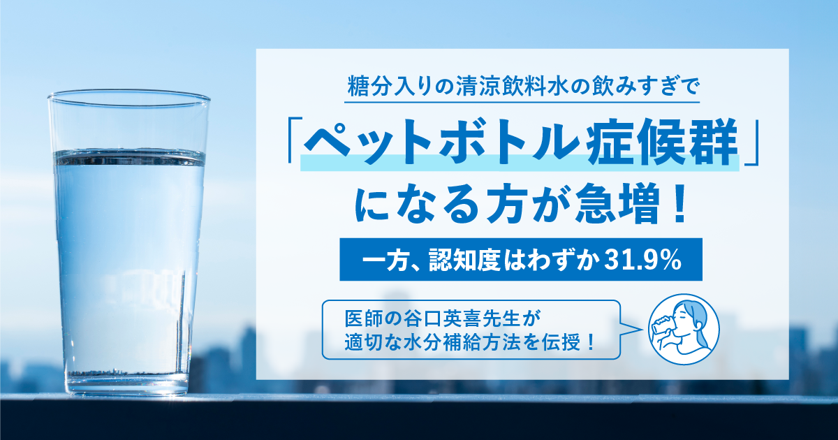 【調査サマリー 】 ・2024年夏は観測史上1位の暑さになると予想。 ・夏の暑さで心配なこと1位は「熱中症にならないか」で75.3%。2位は「十分な水分が摂れているか」で 64.3%、3位は「夏バテしない食事が摂れているか」で50.5%。 ・熱中症対策としておこなっていること1位は「水分を十分に取る」で90.4%、 2位は「エアコンや扇風機をつける」で81.4%、3位は「睡眠を十分に取る」で41.7%。 ・糖分入りの清涼飲料水の飲みすぎで「ペットボトル症候群」になる方が急増! 一方「ペットボトル症候群」の認知度はわずか31.9%。正しい水分補給が鍵に。 ・夏の暑さ対策を目的とした「水分補給」で飲む飲み物1位は「お水」で83.5%。 続いて2位が「緑茶・麦茶・紅茶等のお茶」で66.1%、3位が「スポーツ飲料」で41.0%。 ・医師の谷口英喜先生がペットボトル症候群の対処法や、適切な水分補給方法を伝授! |