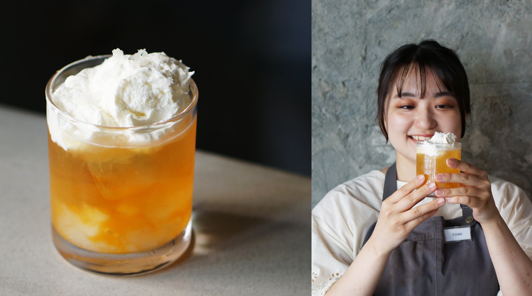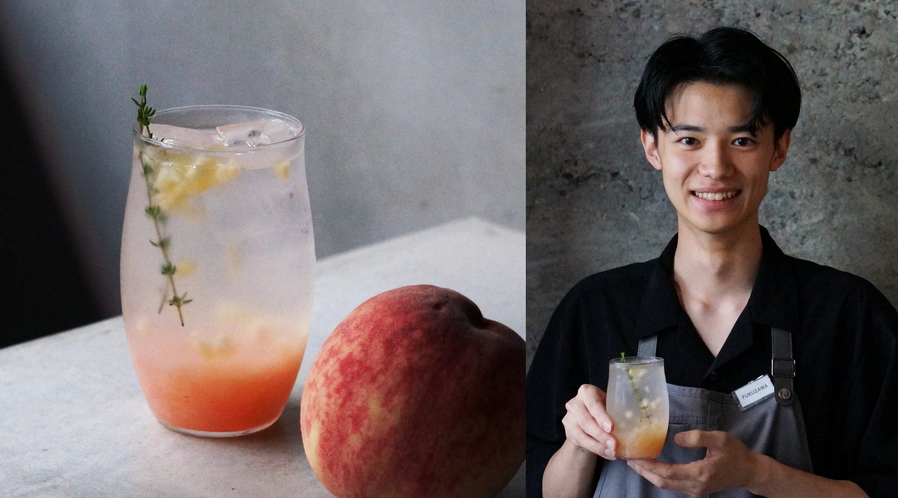 フレッシュの桃とシロップ漬けの桃を合わせ、みずみずしさと異なる食感を堪能できる爽やかな炭酸ドリンク。白ワインをベースにしたシロップにはレモンやカルダモンを使用し、すっきりとした風味で夏らしさを感じていただけるようにしました。
