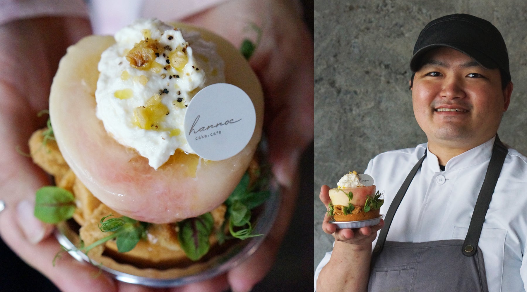 桃のシロップと白あんにクリームチーズを組み合わせたクリームで、烏龍茶のガナッシュと桃の果肉、桃のジャムを閉じ込めました。