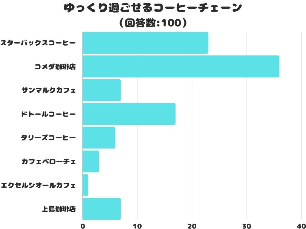 ゆっくり過ごせるコーヒーチェーンをアンケートにて調査したところ、1位は「コメダ珈琲店」でした。