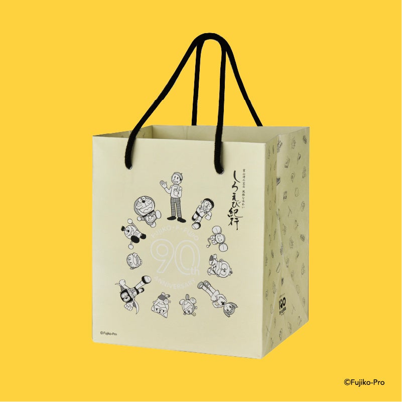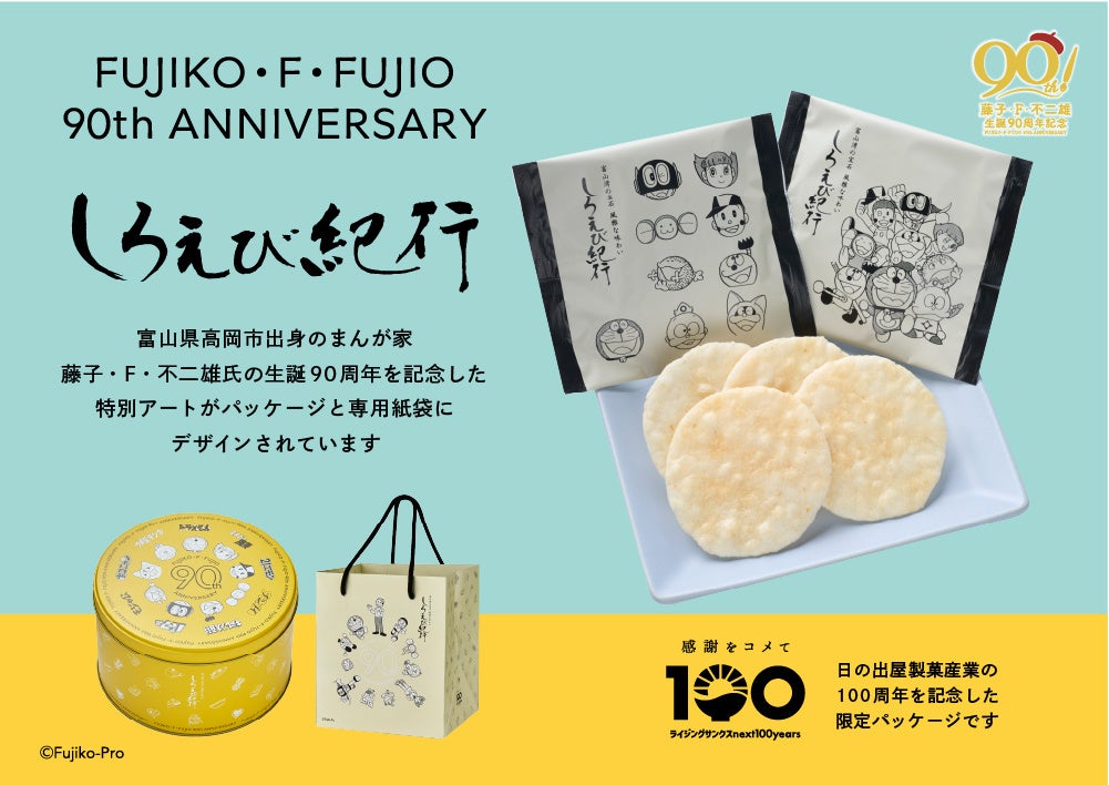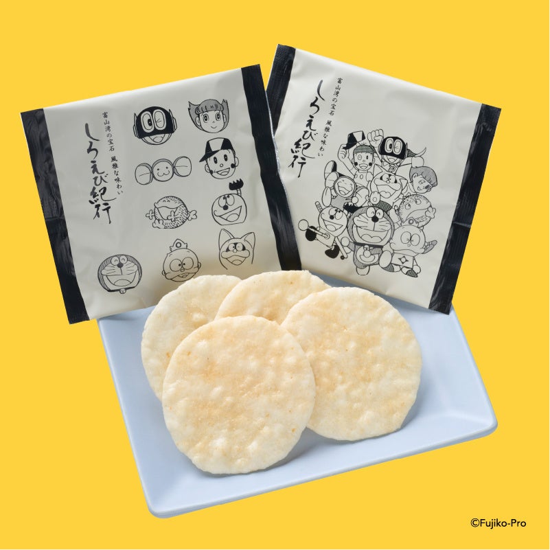 昨年より、富山県高岡市出身のまんが家 藤子・F・不二雄 氏の代表的なキャラクター『ドラえもん』が富山銘菓のしろえび紀行パッケージに登場し、話題となりました。今回は「藤子・F・不二雄生誕90周年」を記念し「ドラえもん」「パーマン」「コロ助」「ポコニャン」をはじめとした、人気のキャラクターたちがデザインされています。個包装は2種類あり、専用紙袋も付いています。手土産やプレゼントにもおすすめです!