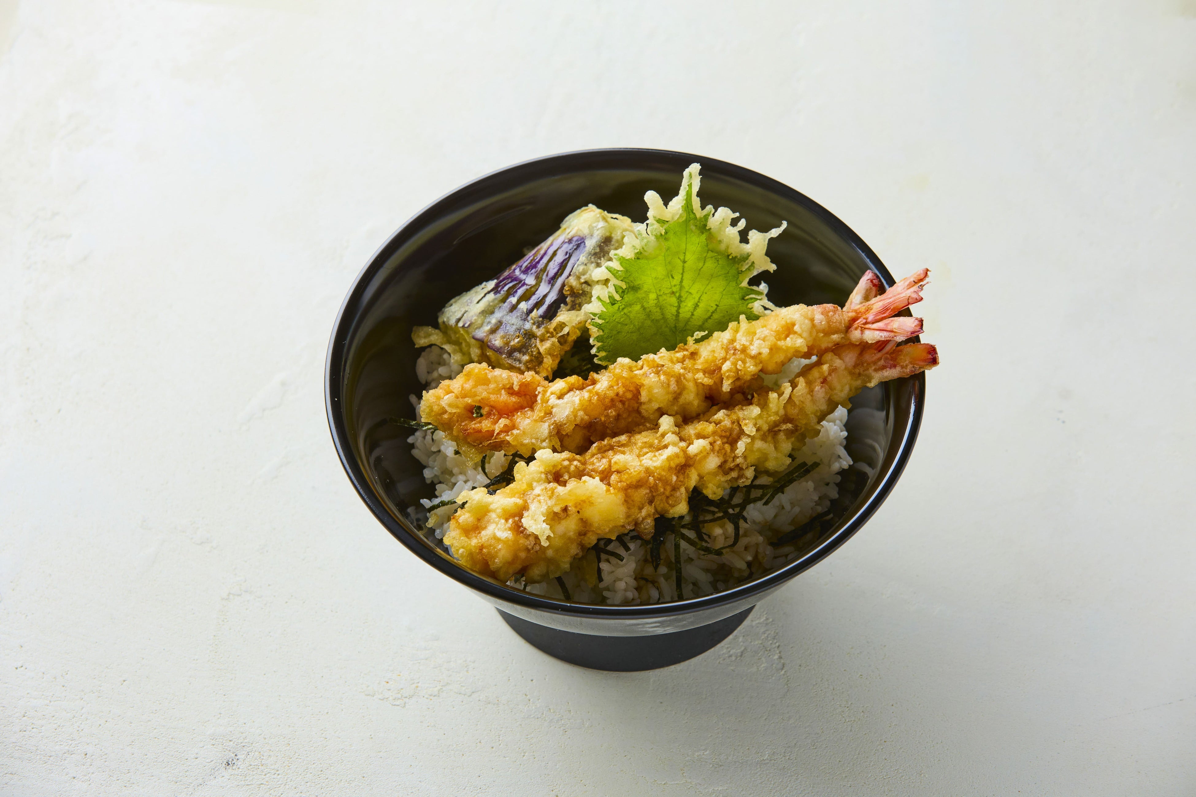 三河湾の特産品である天然車海老を使用した天丼。新鮮な地元野菜の天ぷらが、一層おいしさを引き立てます。