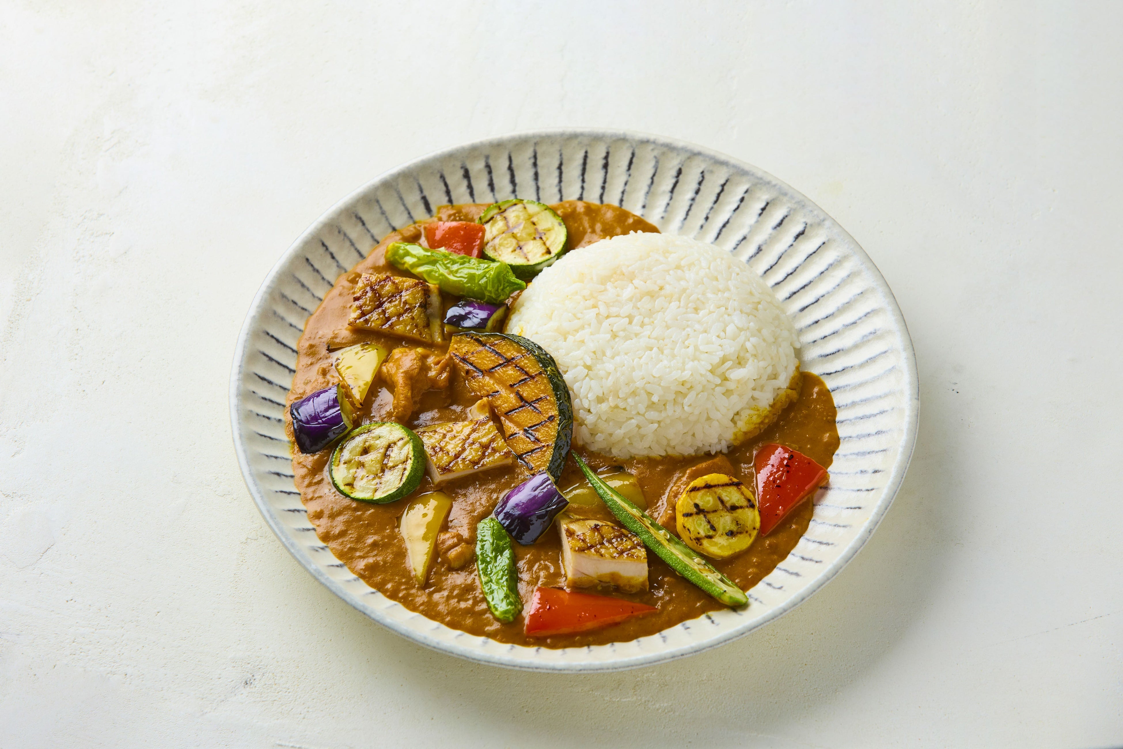 ズッキーニ、パプリカ、南瓜などの色とりどりの夏やさいをふんだんに使い、スパイスの効いたカレーに仕上げています。